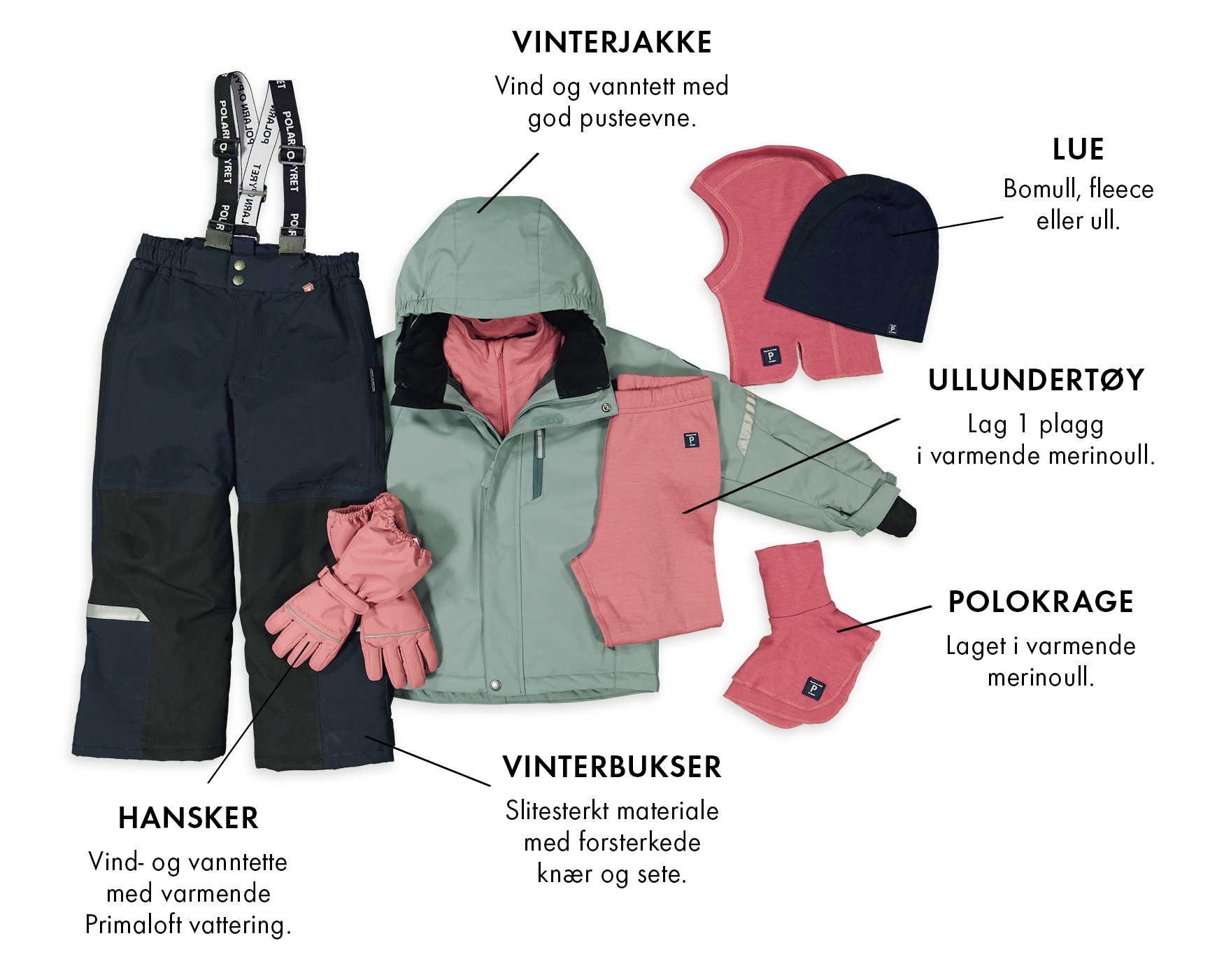 - Lag 2 - varmende mellomlag i fleece eller ullfrotté holder barna varme hele dagen.