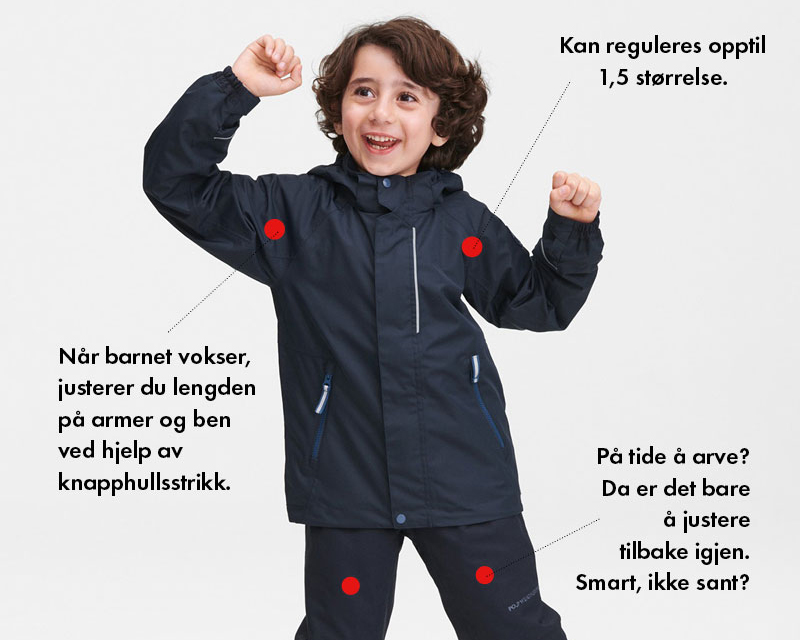 - Plagget har flere justeringsinnstillinger, noe som gjør at plagget kan vokse i takt med barnet. På den måten unngår man at barnet bruker et plagg som er for stort eller at plagget slites unødig.