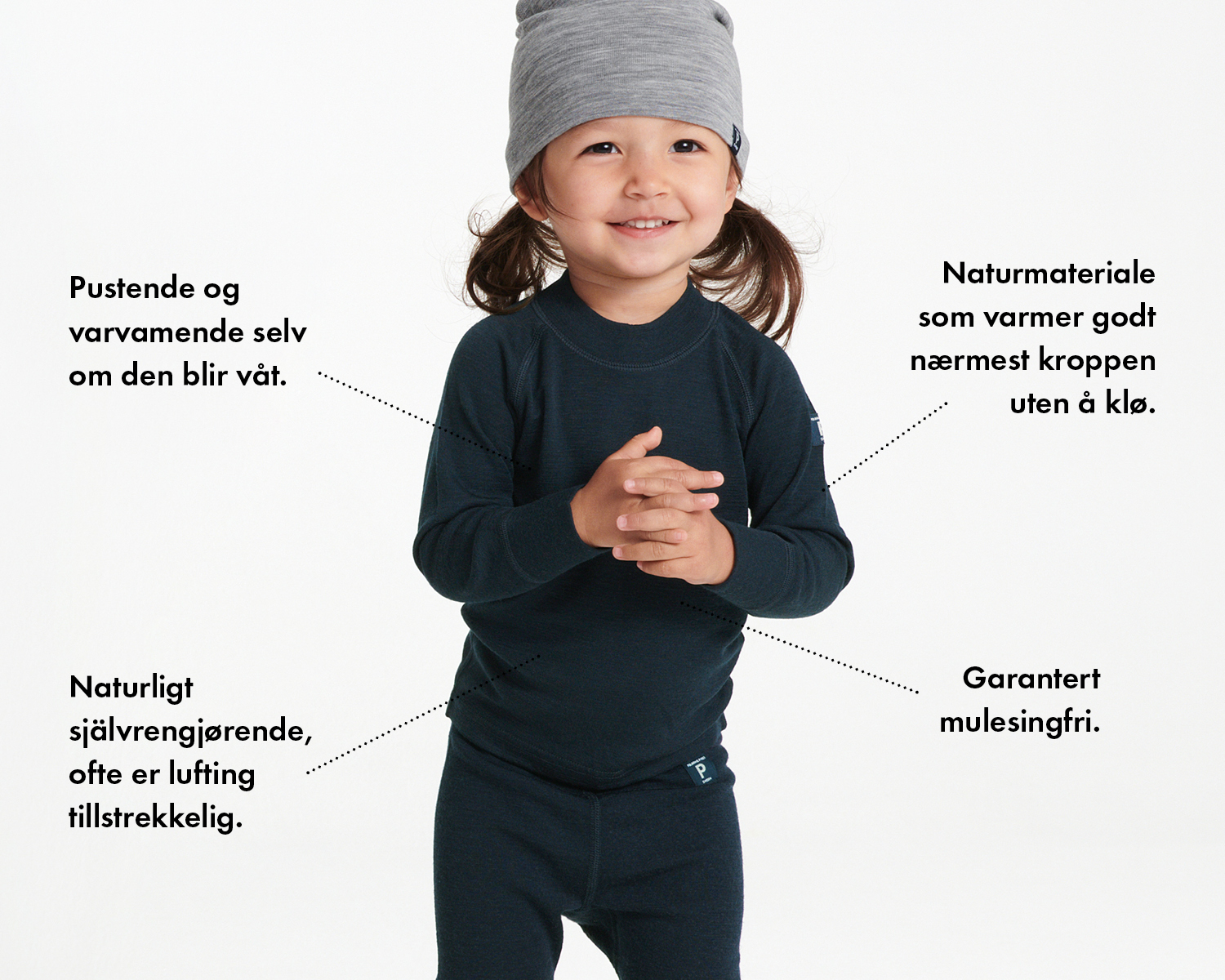 Det man da trenger, er materialer som kan holde barnet både varmt og tørt. Og derfor anbefaler vi ullundertøy. Ull er naturens eget supermateriale, siden det har evne til å puster og varme godt selv om det blir vått. Ull er dessuten ekstra bra for nyfødte og små barn, som ennå ikke har rukket å utvikle den samme varmereguleringen som større barn og voksne har.